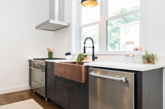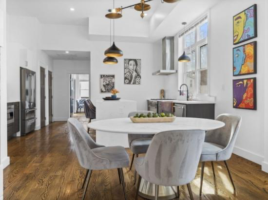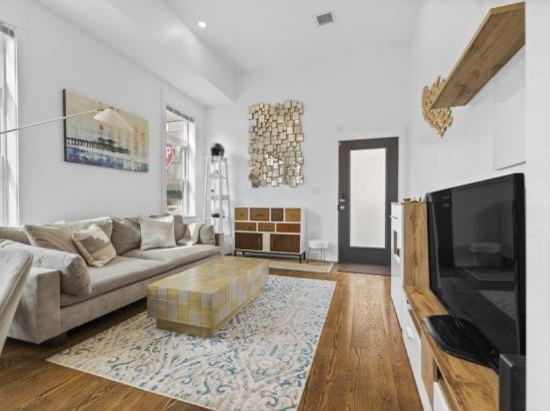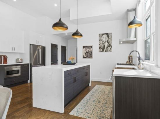 厨房配备 36 英寸专业 Bertazzoni 系列和电器、石英台面、铜水槽以及定制的餐具室和橱柜。起居区延伸到下层,配有干吧、饮料冷却器和单元内洗衣房。 充足的存储空间——包括主卧室的 2 个定制壁橱和次卧室的步入式衣橱。