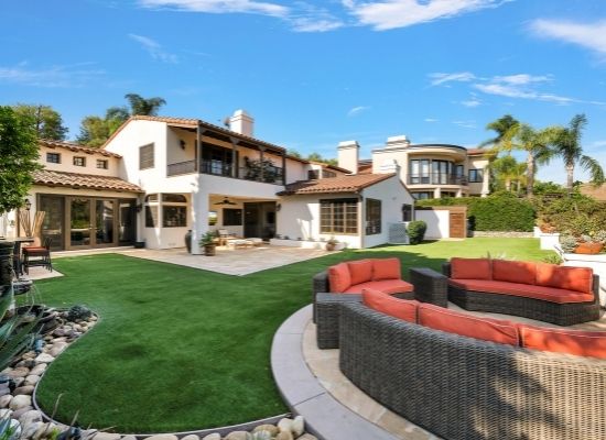 进入守卫门控的卡拉巴萨斯公园庄园, 视线不由自主地停留在高尔夫球场和山脊线景观 。
